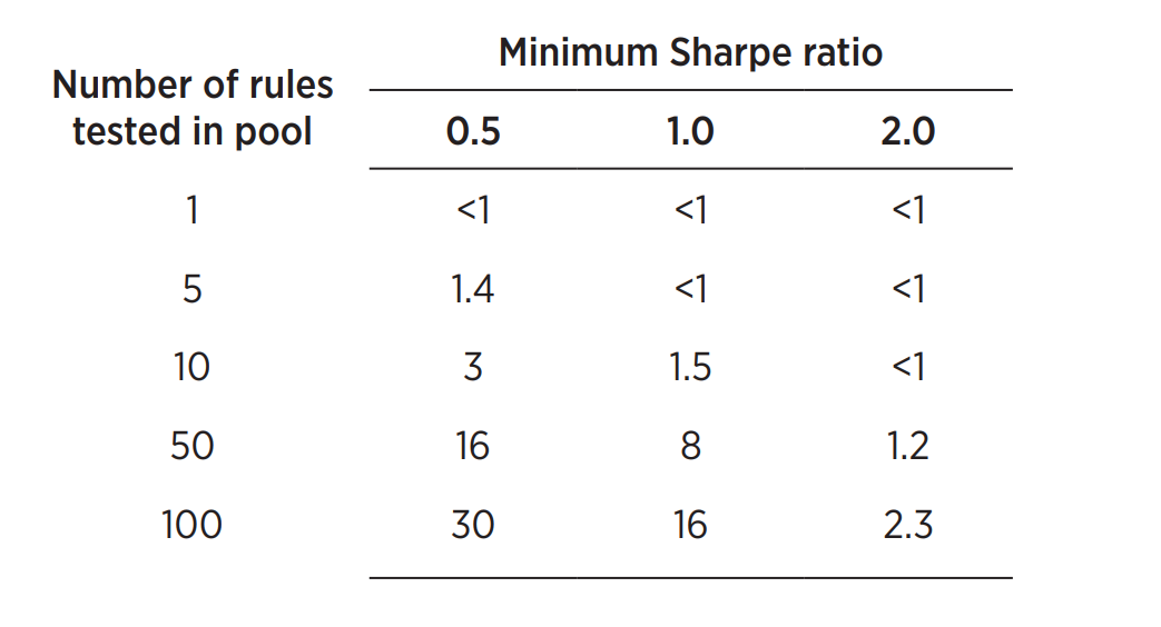 В таблице показано отсечение коэффициента Шарпа, необходимое при тестировании пула (строк) торговых правил заданного размера с определенным количеством исторических данных (столбцов) за несколько лет, чтобы гарантировать, что у вас есть только 5% шанс выбрать один или несколько действительно плохих. правила.