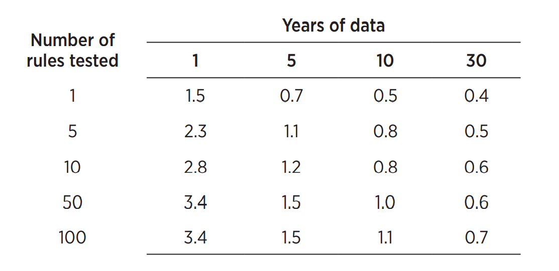 Вы уже видели, что распространенной ошибкой является использование недостаточного количества исторических данных для выбора или калибровки правила. Сколько данных вам нужно? Сколько времени вам нужно, чтобы решить, имеет ли правило положительный коэффициент Шарпа (SR) и стоит ли его сохранять?