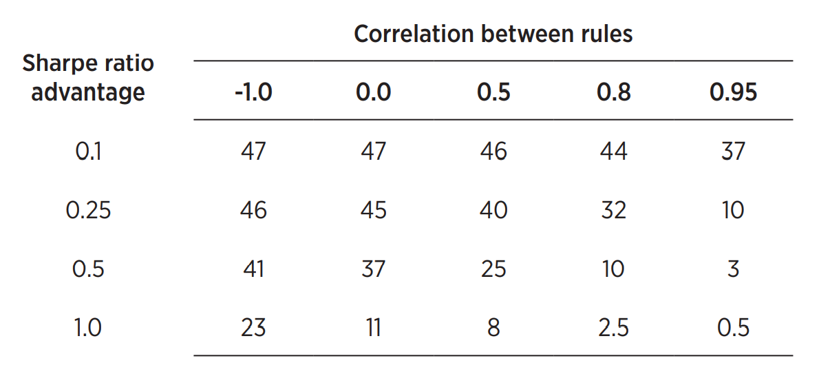 В качестве примера у меня есть два торговых правила в моем собственном портфеле, которые для типичного отдельного инструмента имеют коэффициенты Шарпа (SR) в среднем 0,05 и 0,30 соответственно. Несмотря на то, что они совершенно не коррелированы, таблица 6 показывает, что мне понадобилось бы 45 лет, чтобы различить их; почти невозможно, когда даже самые ранние финансовые фьючерсы начали торговаться только в 1972 году. Однако те же самые правила применяются к портфелю инструментов, где SR составляет 0,13 и 1,13.54Таблица показывает, что мне понадобились данные всего за 11 лет, чтобы отличить эти два коэффициента Шарпа друг от друга.