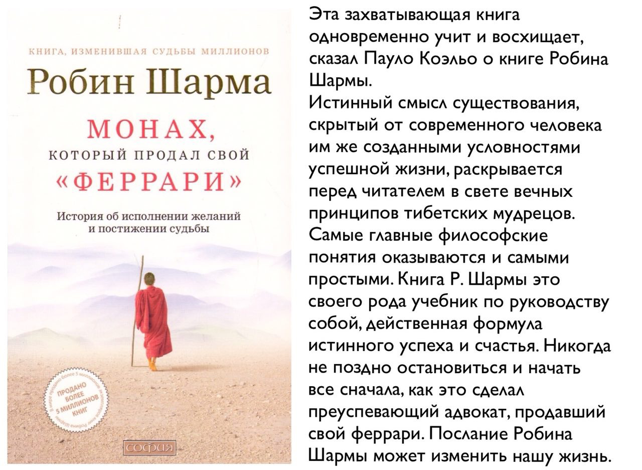 Все это случилось больше трех лет назад. Позднее Джулиан отправился в какую-то экспедицию в Индию — это было последнее, что я о нем слышал. Он сообщил одному из своих партнеров, что желает упростить свою жизнь и «отыскать ответы на некоторые вопросы» и надеется найти их в той загадочной земле. Он продал свой особняк, свой самолет и свой собственный остров. Он даже продал свой «феррари». «Подумать только, Джулиан Мэнтл — индийский йог, — размышлял я. — Порой Закон оборачивается крайне неожиданной стороной».