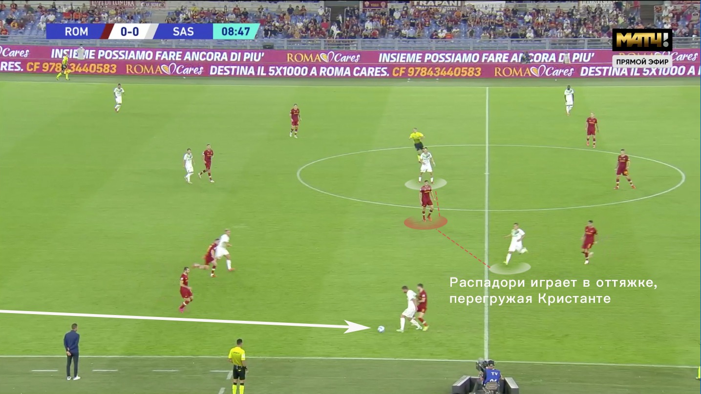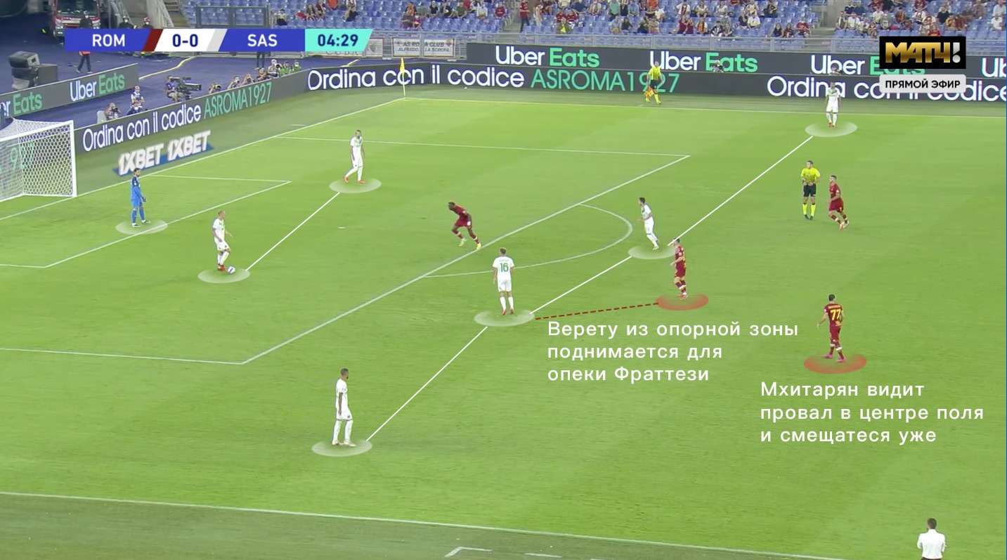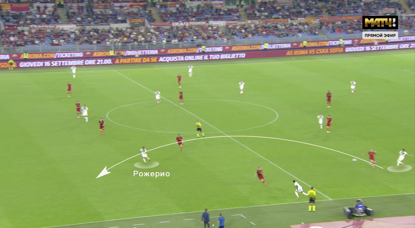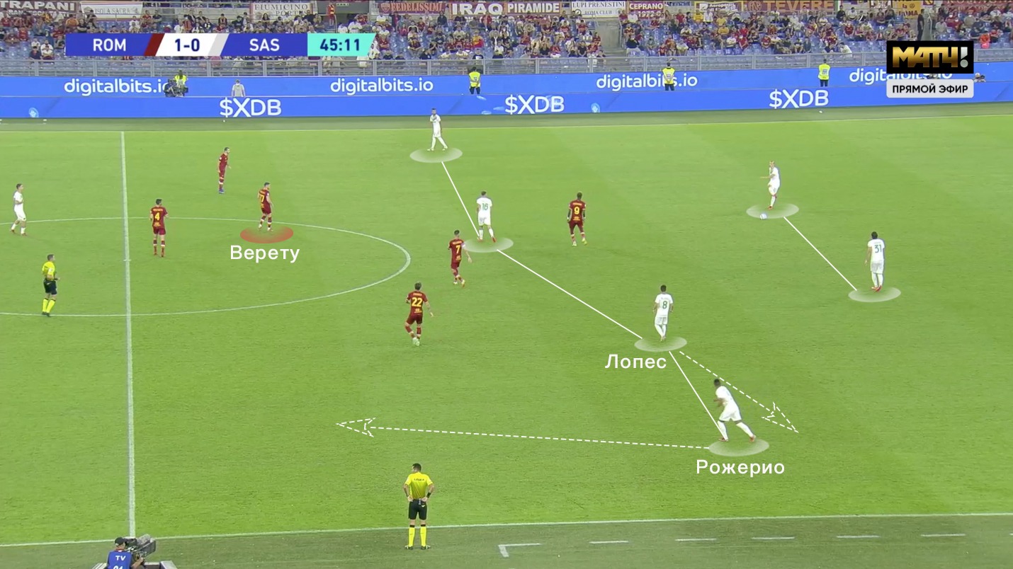 Даже по первым турам можно заметить, как Дионизи сохраняет и улучшает уже имеющуюся систему команды. Отличительной чертой «Нероверди» является короткий билд-ап 2-4 (+ активное участие вратаря в розыгрышах). «Сассуоло» старается спровоцировать прессинг соперника - выманить прессинг-блок и быстро доставить мяч либо в разрыв между линиями, либо за спины высокой линии обороны. В матче с «Ромой» можно было наблюдать оба варианта.