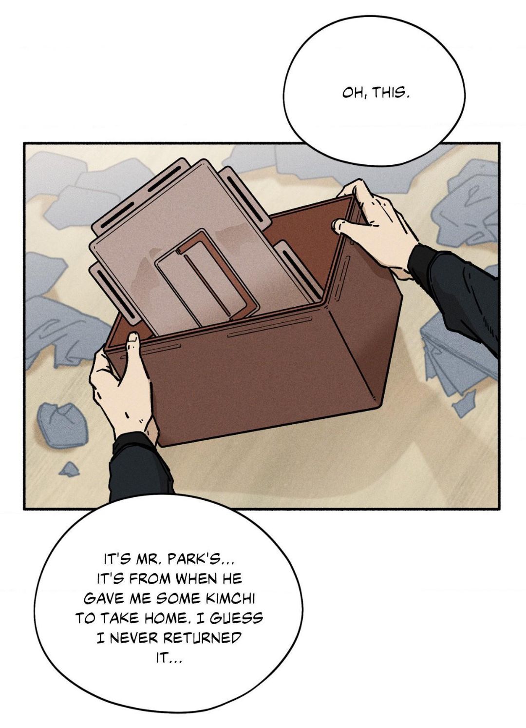 — Ох, это... Это же мистера Пака... Он остался с тех пор, как он дал мне немного кимчи, чтобы я отнёс его домой. Кажется, я его так и не вернул...