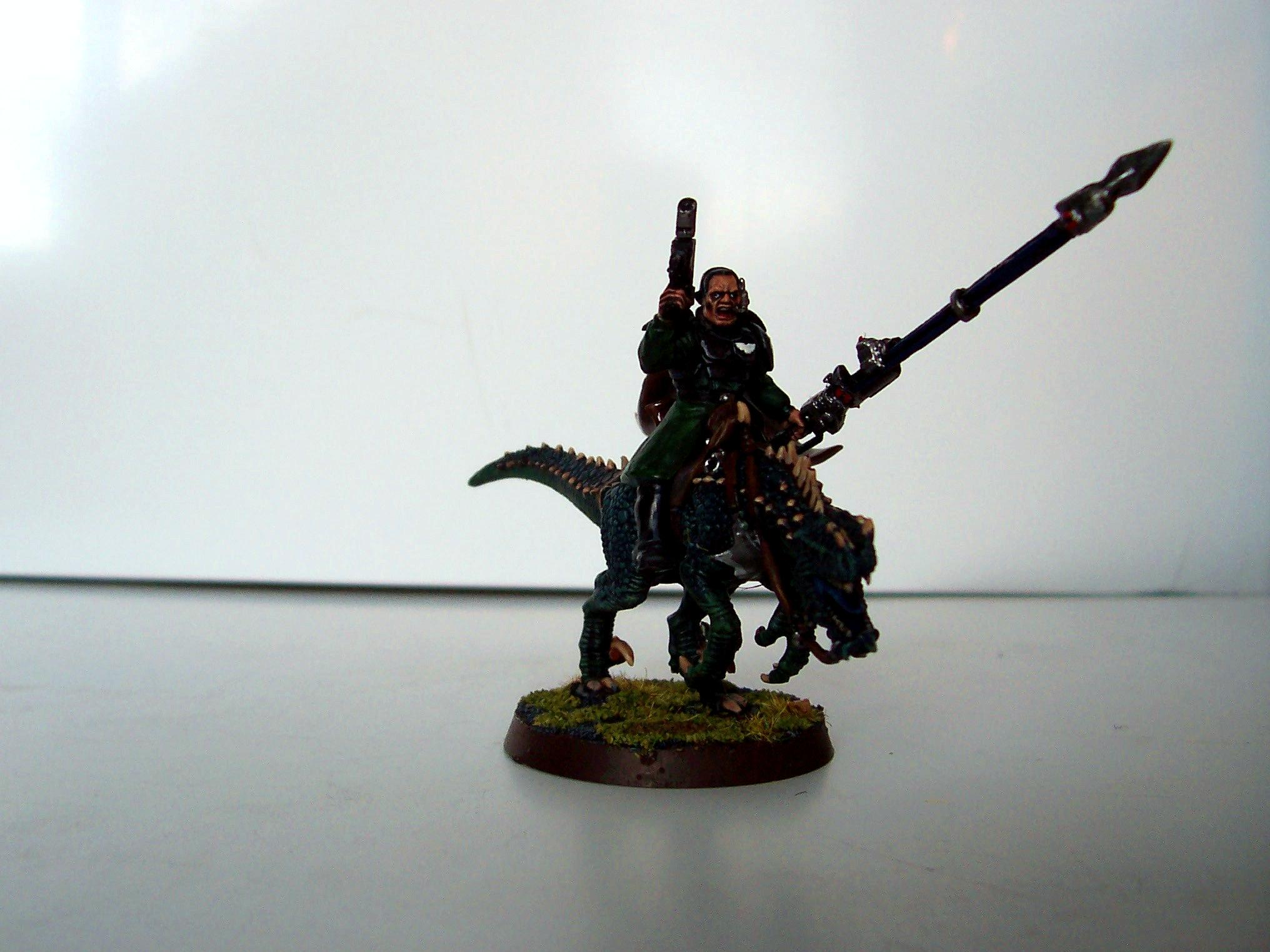 A Catachan Jungle Fighters Rough Rider riding a mighty Giant Reptile mount native to his jungle homeworld of Catachan .