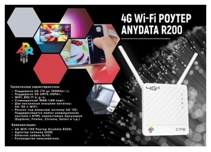AnyDATA R200 . 2020 год SIM . WAN: SIM-карта . Подключение: LAN 1 порт, 100 Мбит/с . Wi-Fi: Wi-Fi 4 (N), 2 .4 ГГц . Антенны и сигнал: 2 антенн (ы), несъемные . Беспроводный роутер класса N150, предназначенный для работы в сетях сотовой связи стандарта 3G/4G (LTE) и организации подключения клиентских устройств с . . .