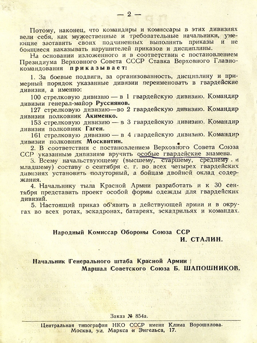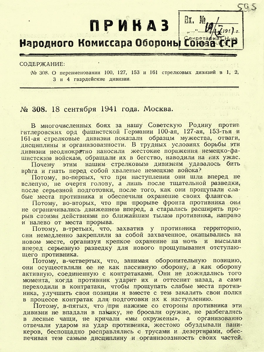 В сентябре 1941 года Народным комиссаром обороны СССР И.Сталиным был издан приказ «О переименовании 100, 127, 153 и 161 стрелковых дивизий в 1, 2, 3 и 4 гвардейские дивизии». Это были первые гвардейские части за всю историю существования Рабоче-Крестьянской Красной Армии.