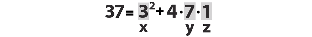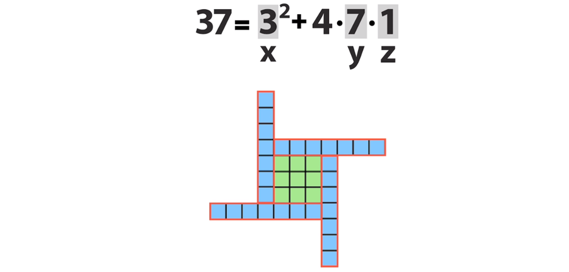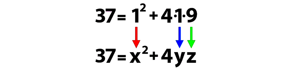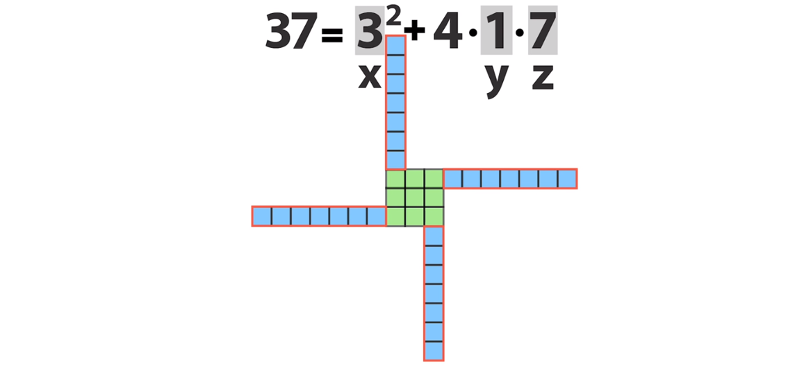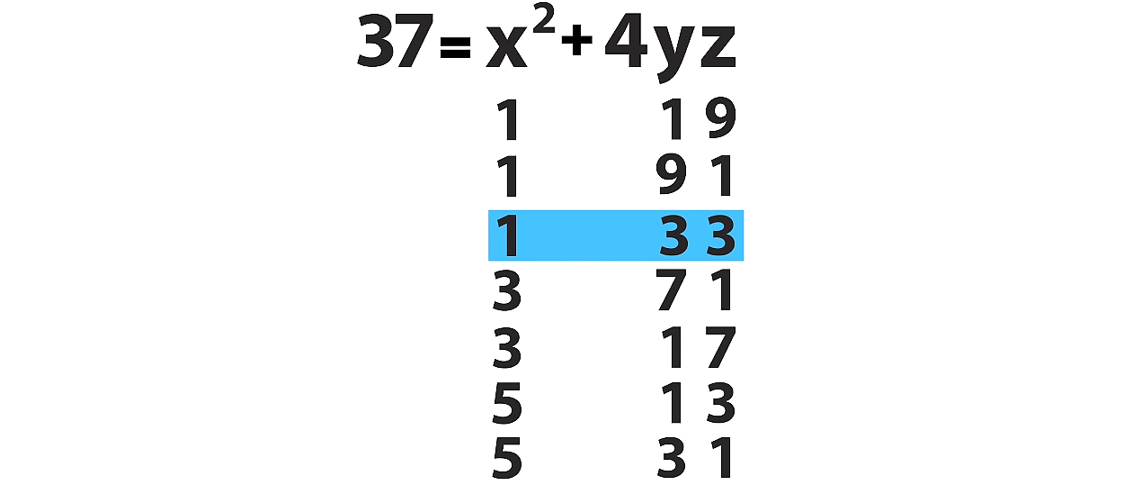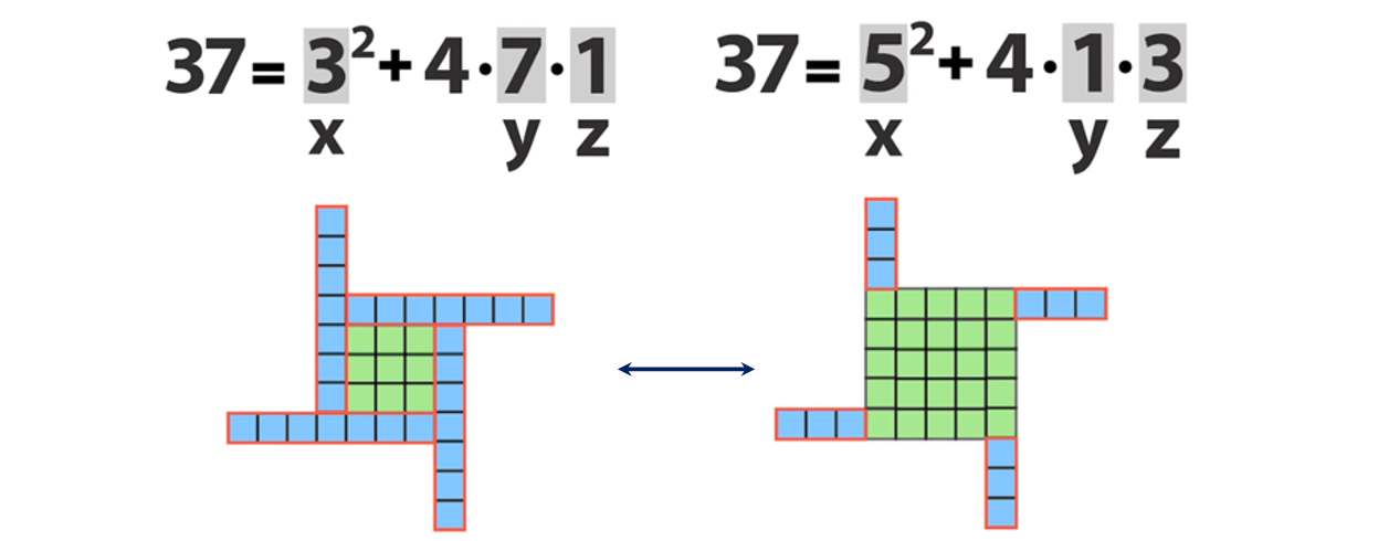 А теперь само волшебство! Как, например, в решении 37 = 3² + 4·7·1 увидеть ещё одно решение — а именно, 37 = 5² + 4·1·3?