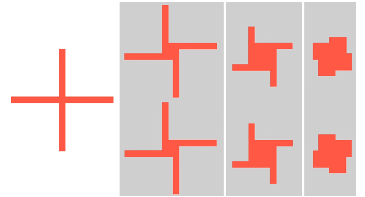 Классификация их по контурам очертания даёт ещё один способ разбиения на пары. Единственным исключением теперь является контур очертания мельницы с прямым крестом, который встречается только один раз. Все остальные ветряные мельницы идут совпадающими парами. Для того чтобы убедиться в этом, нужно проделать несложную работу — отметить все случаи того, как прямоугольные лопасти могут располагаться вокруг квадратного сердечника. Очевидно, что очертание прямо-крестовой ветряной мельницы встречается только один раз и всегда существует хотя бы одна такая прямо-крестовая мельница, соответствующая основному решению.