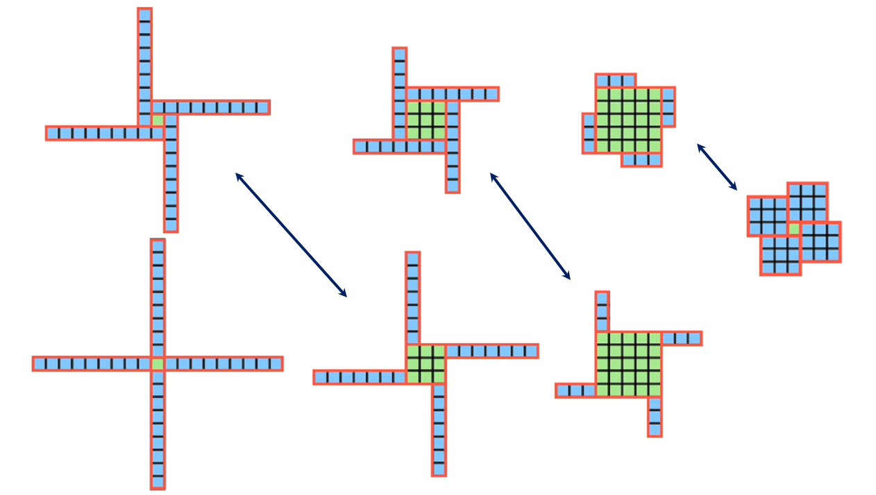 Глядя на любую мельницу, имеющую зелёное ядро, мы получим вторую ветряную мельницу — второе решение, разрезав середину вдоль лопастей мельницы, вот так: