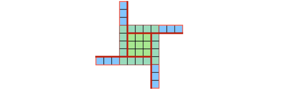 Здесь 3² — это площадь квадрата со стороной 3, а 4·7·1 — площадь четырёх прямоугольников со сторонами 7 и 1.