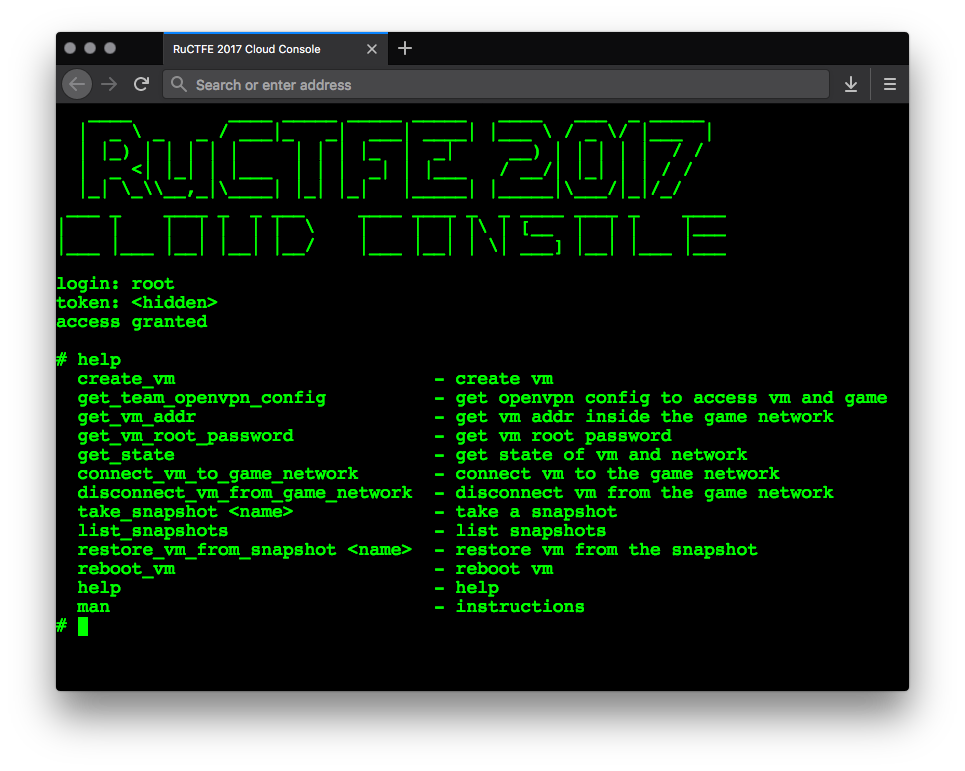 A: Before now all RuCTFE participants had to deploy vulnerable image on their own servers and PCs. This year we thought that for some teams it might actually be a problem. That is why now you can deploy the image on our servers! No more pain with lingering ping, unstable internet, search for a server and its first setup. And, of course, it is convenient for geographically dispersed teams, which is more or less what our developers' team looks like :)