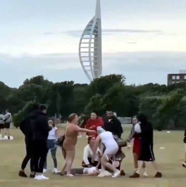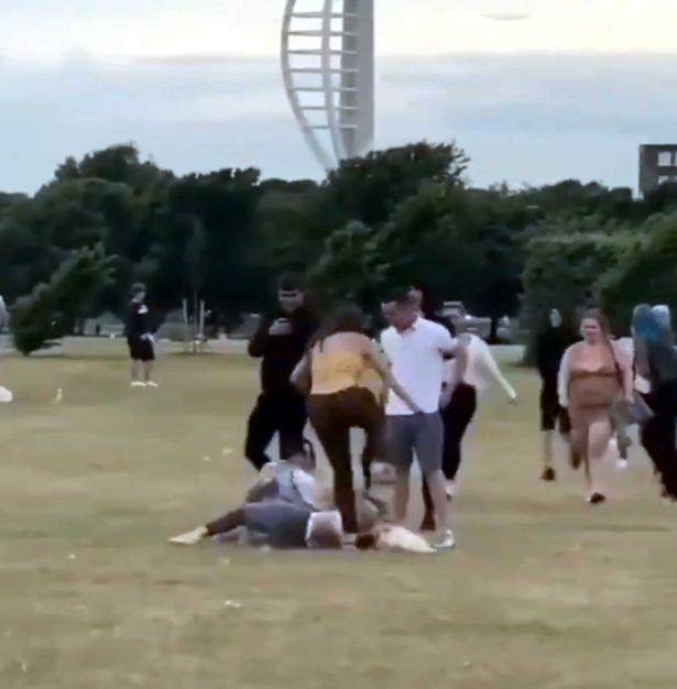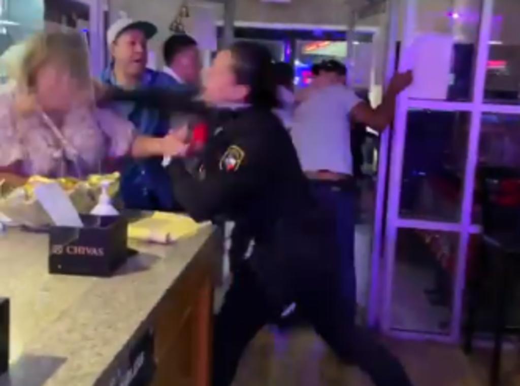 Además de haber sido golpeada con la mesa, la mujer rubia también es atacada por un hombre vestido de azul que le da un certero golpe a puño cerrado en la parte posterior de la cabeza .