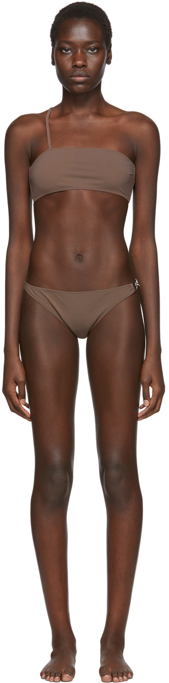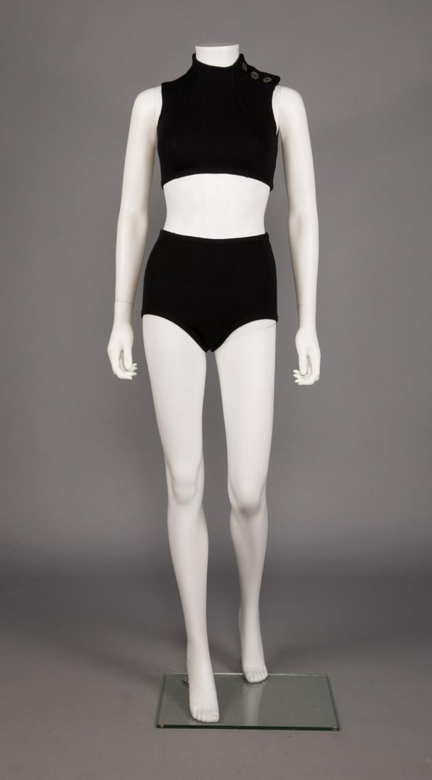 This bikini of brown wool knit with black wool banded edges is an amalgamation of angles . Designer: Rudi Gernreich (American (born Austria), Vienna 1922-1985 Los Angeles, California) .