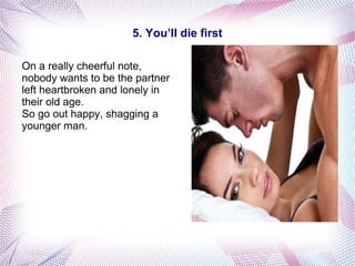 In fact, the desire to remain child-free may account for many younger men seeking older female partners in the first place . The important thing is to talk about it . Be courageous . Despite the prevalence of the cougar trend, older women shouldn't expect society to treat their relationships with younger men as "normal ."