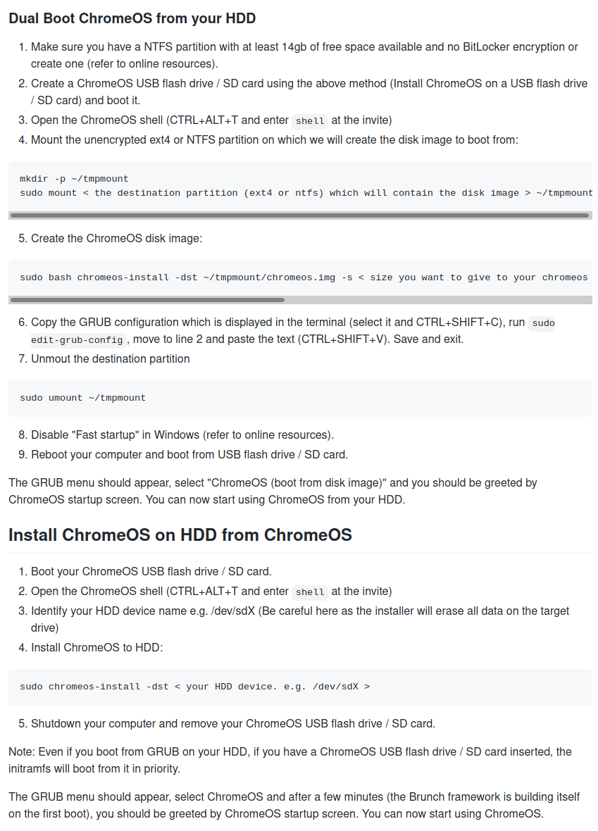The official guide is hosted on the developer's GitHub repository. What I'm doing here is writing a guide not written in the repo's wiki or README.md, but rather a step-by-step recipe to making a working laptop that runs Chrome OS on an external drive with multiple partitions.