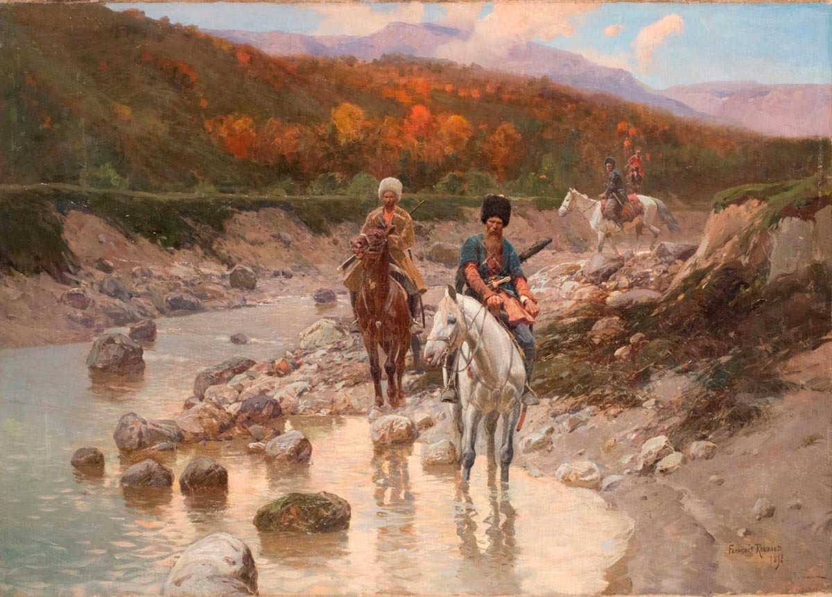 Франц Рубо. Казаци край планинска река, 1892