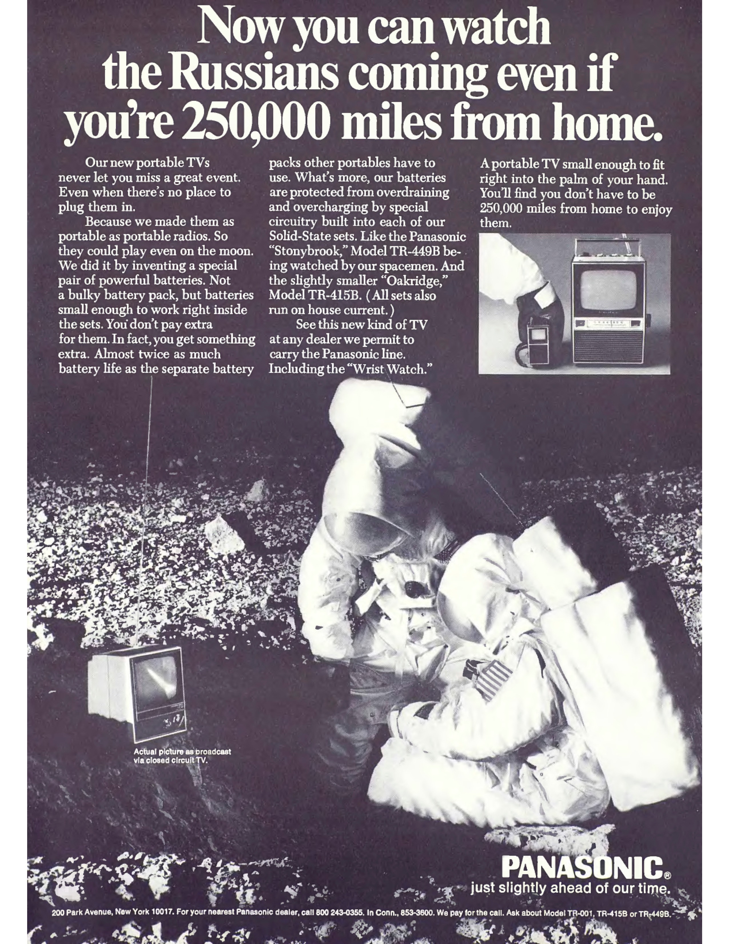 Это было в 98 году. Время без интернета, либгена и сайхаба. Однажды знакомые попросили меня погулять по городу с американкой, которая жила у них по обмену. Я очень плохо говорил на английском и часто задейстовал язык жестов. Показал Тане Дэй (так звали мою новую американскую приятельницу) улицы и церкви, площади и набережную. Когда мы прощались, я попросил Татьяну прислать мне научный текст на английском. Думал, что вообще-то полезно начать читать на другом языке. Проблема в том, что я просто НЕ ЗНАЛ, что почитать. То есть тогда у меня еще не было ни одного списка. В зеленом словаре Современная западная философия в литературе к статье Постмодернизм я нашел ссылку на статью: LA. Fiedler. Cross the border — close the gap: Postmodernism // Playboy. 1969, 12. Через несколько месяцев мне пришло письмо, в котором была копия статьи и еще кое-что. Таня написала: "Смотри какую я крутую штуку нашла! В память о нашей прогулке". В конверте лежала копия рекламы портативного телевизора Panasonic из того же декабрьского номера Playboy со статьей, который вышел после высадки американцев на Луне. На фотографии изображены два американских астронавта в скафандрах на поверхности Луны, которые видят на портативном телевизоре летящую баллистическую ракету. Надпись гласит: «Теперь Вы можете смотреть, как русские идут, даже если вы находитесь за 250 000 миль от дома». Этот одновременно иронический и серьезный образ расколотой на политические блоки планеты, которые соревнуются в смертельной гонке, невероятно далек от образа единого и универсального человечества в движении NewSpace Илона Маска и Джеффа Безоса. Здесь человество, которое нужно спасти, в котором нет русских и американцев. На самом деле, глобальный (ради всего человечества!) и национальный (ура, мы сделали русских!) масштабы часто сталкиваются друг с другом в освоении космоса. Согласно Закону о космосе космонавты и астронавты считаются "эмиссарами человечества", а вот вещи принадлежат государствам, за которые они несут отсвественность, если, артефакты, например, упадут на голову. Тогда, на заре космической эры, технологии и коммерция удачно вписываются в этот национальный нарратив Space Race.