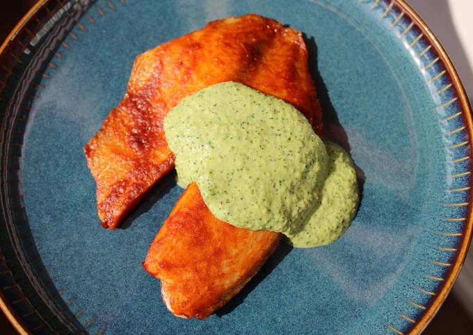 Красная рыба, жареная на сковороде, с соусом из авокадо . . .