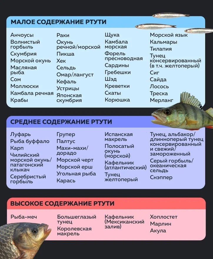 1. Накопление ртути в рыбе зависит от её величины и долголетия. Действительно много могут накопить крупные хищники, типа акулы или рыбы-меч. И некоторые виды тунца (дорогие и премиальные). Большинство видов лосося и моллюсков являются короткоживущими и не успевают накопить значительное количество.