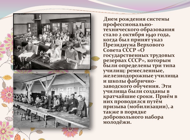 2 октября профтехобразованию России исполняется 80 лет . Давайте немного поговорим об истории профтехобразования . Днем рождения системы профессиональнотехнического образования стало 2 октября 1940 года, когда был принят указ Президиума Верхового Совета . . .