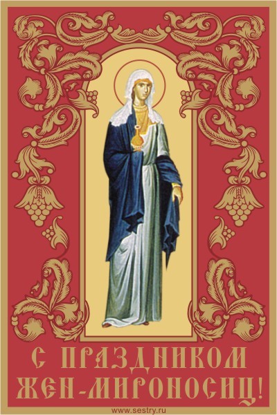 В Православии этот день считается праздником всех женщин-христианок без исключения . На Руси считали, что в День жен-мироносиц все Устраивались женские гуляния и посиделки, на которые собирались исключительно женщины . С днем жен-мироносиц — картинки, открытки . . .
