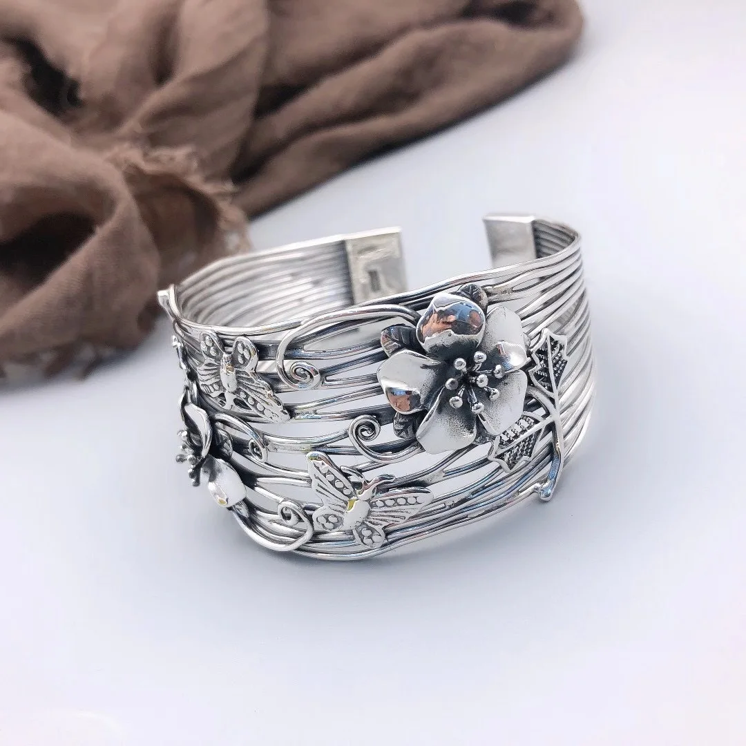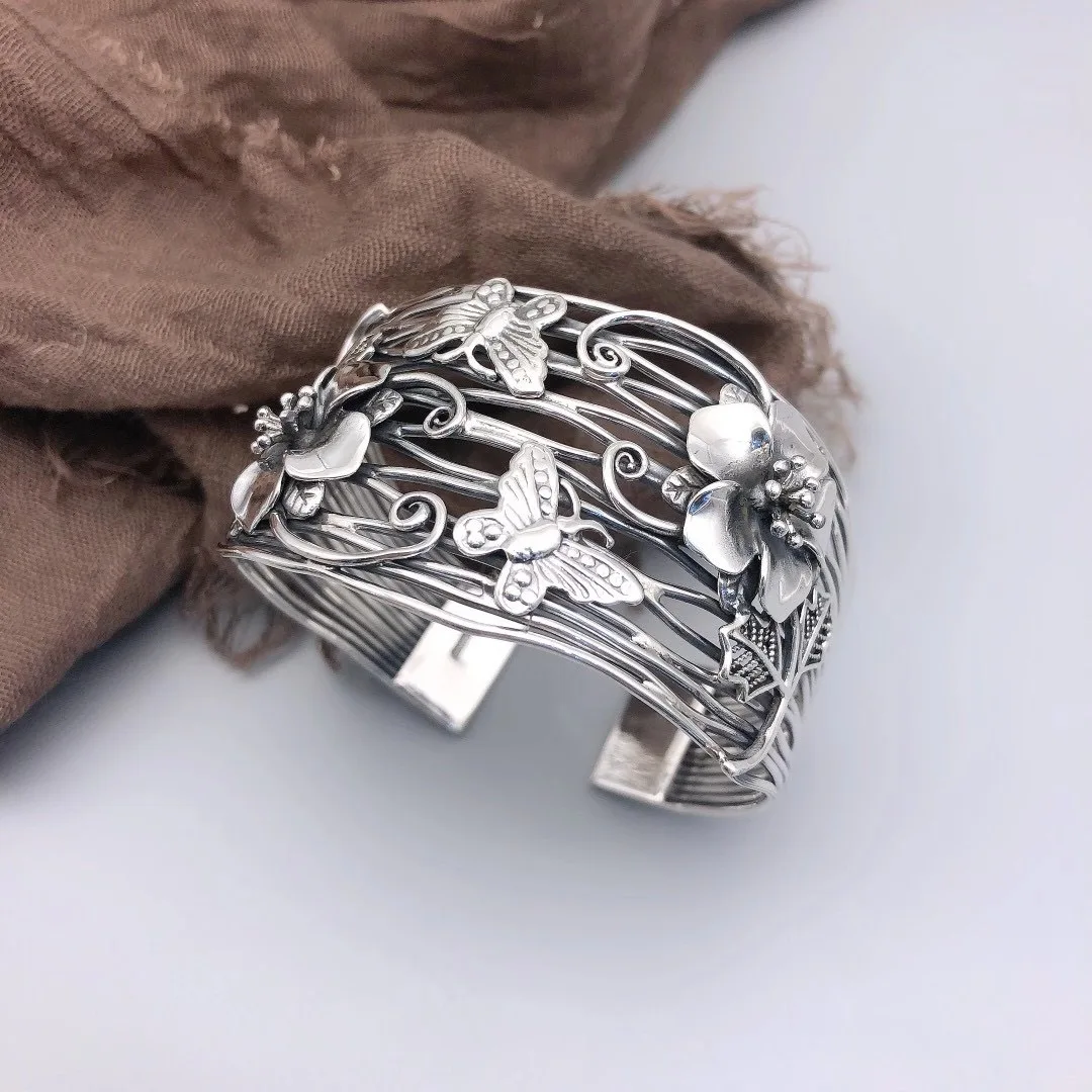«S999 Pure Silver Handmade Silver Cuff Bracelet Multi-Layer Retro Ethnic Style Butterfly Love Flower Exaggerated Large Bangle» по лучшей цене на рынке! Всего за 96$ (9120рублей)