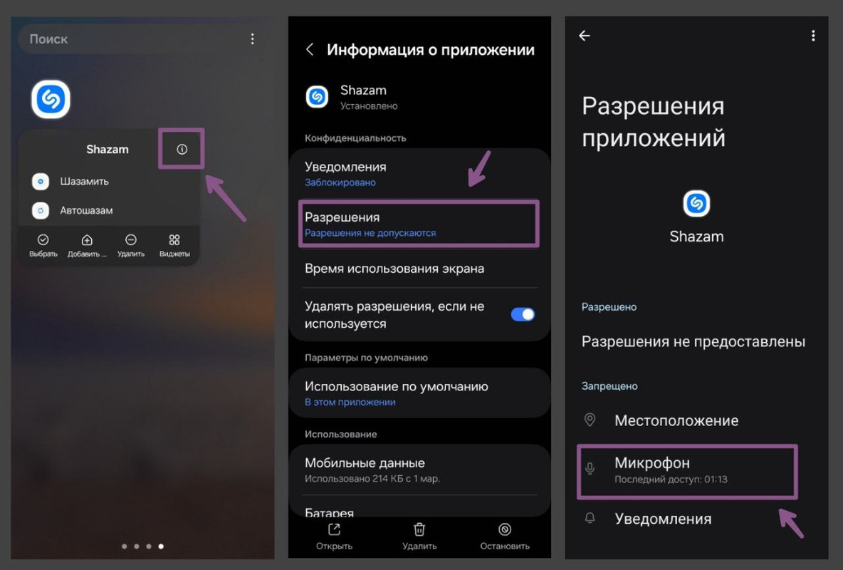 3️⃣ Переходим в раздел «Разрешения» и предоставляем доступ на микрофон и память устройства.