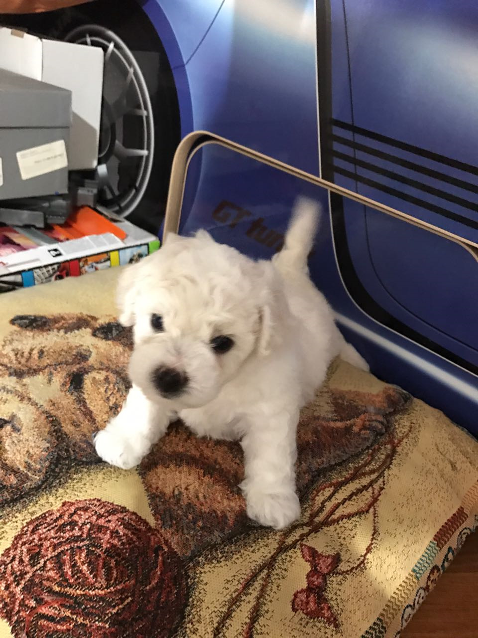 Фото бишон фризе . . . Щенки бишон фризе очень крохотны . Не позволяйте маленьким детям играться с ним без присмотра взрослых, чтобы не травмировать животное .
