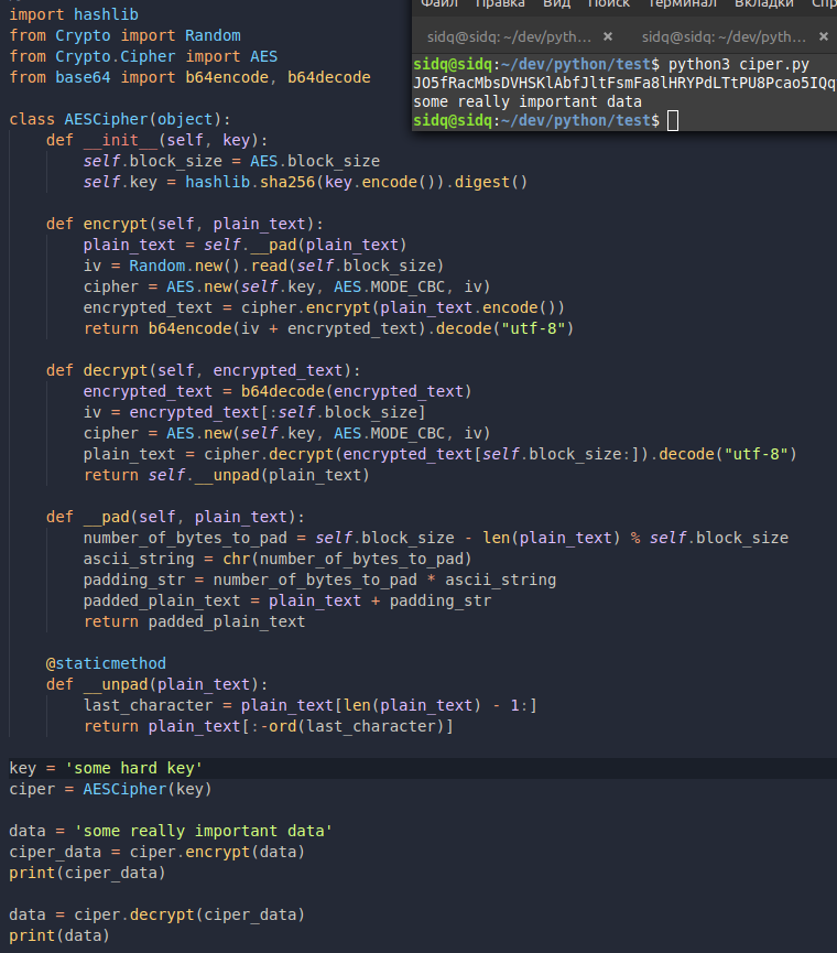 На пайтон мені не дуже подобається як це все зроблено, це все працює через модуль PyCrypto, з яким дуже часто бувають проблеми, але все одно потрібно.