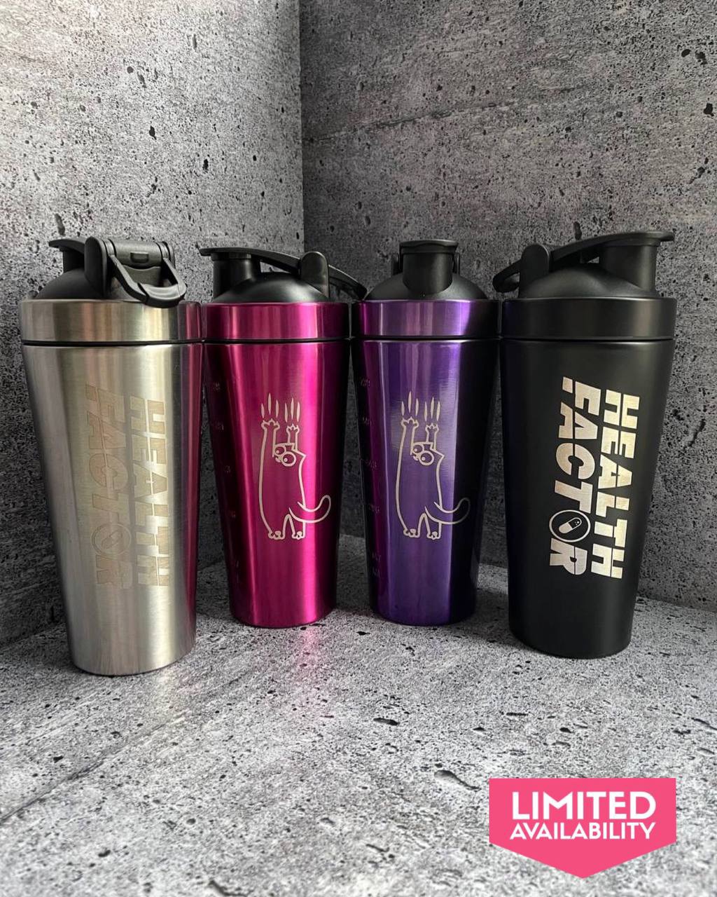 Представлены в 4 оттенках, и на каждом шейкере эмблема нашего бренда Health Factor и котик с обратной стороны 😻