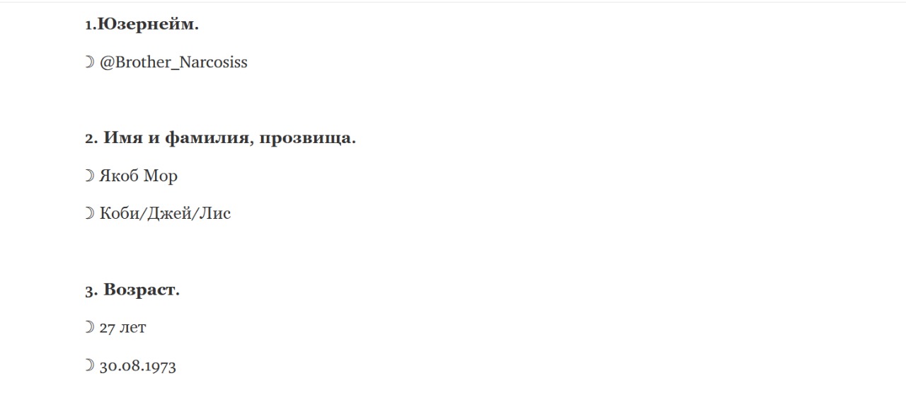 ☽ Характер вашего персонажа. Должны быть расписаны сильные, слабые стороны, травмы, как они влияют на поведение вашего персонажа, особенности взаимодействия с людьми.