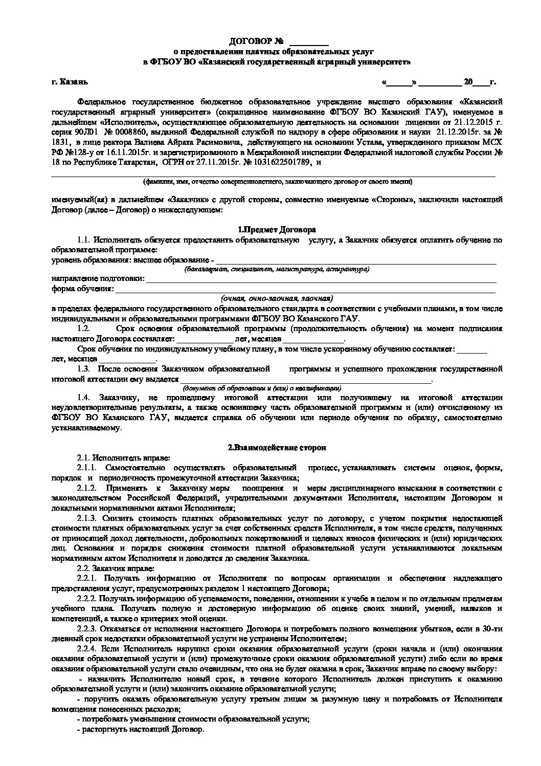 Шаблон договора обучение