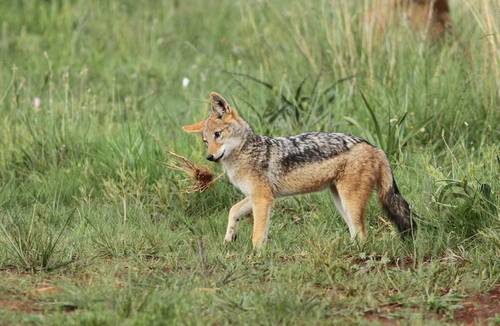 Полосатый шакал получил название благодаря черным полосам по бокам тела . Это небольшое животное способно атаковать даже маленьких детенышей антилоп, но при случае шакал лакомится и мертвечиной .