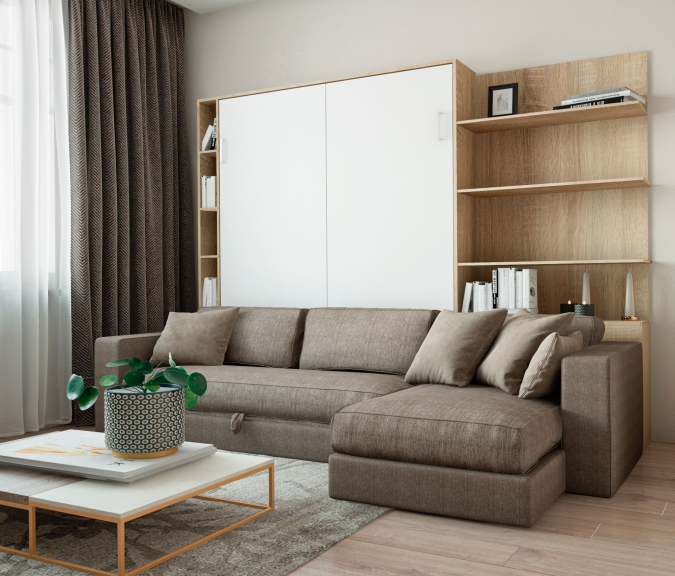 Современная встраиваемая мебель, такая как шкаф-диван-кровать трансформер, подходит для малогабаритных квартир . Она удобна и функциональна, вписывается в большинство интерьеров .