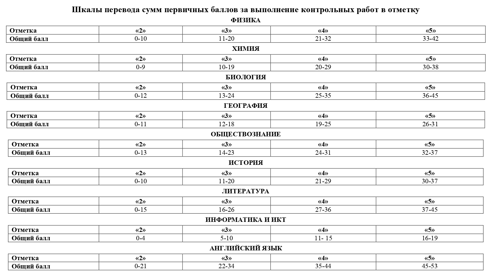 Шкала перевода баллов за контрольную работу в 9 классе