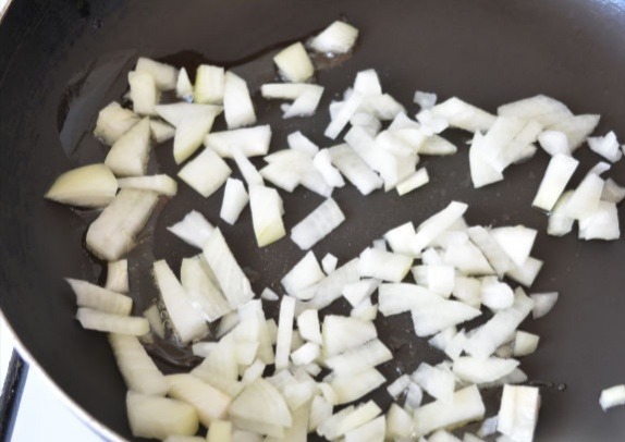 3. Обжарим лук на сковороде с растительным маслом буквально 1 минуту.