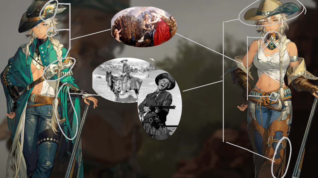 Павлиньи мотивы есть как и в навыках Аргус, так и в её дизайне: на шее есть ожерелье с пером павлина, павлин изображен на пряжке ремня, на втором инсайте те же перья появляются на шляпе и на серёжках, также перья есть на спэшл-арте, ульте и на других навыках.