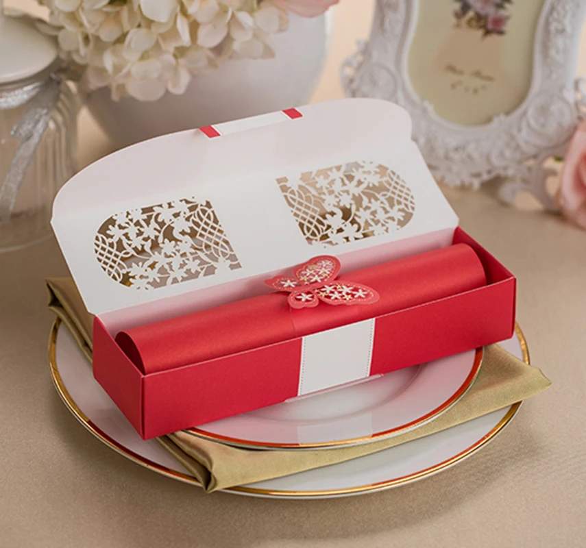 «Шт. 50 шт. лазерная резка красная коробка упаковка свадебные пригласительные открытки с рулон стиль внутренний лист, Персонализация и настроить, красный цвет» по лучшей цене на рынке! Всего за 59$ (5605рублей)