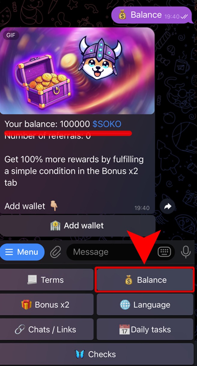 $SOKO Balance⬅️BackTo check the amount of your coins, open the bot menu and click the "Balance" button.In the same section, you can also find information about the number of your referrals.Other Sections:🔗 Links💰 Airdrop💸 Extra $🐦⬛ Twitter⬅️Back