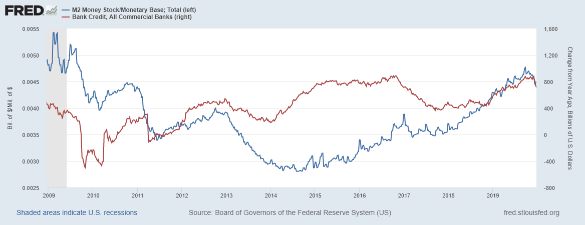 Как ранее и указывал, смягчение ДКП от ФРС вызвало снижение кредитного мультипликатора и, как результат, снижение годовых темпов кредитования.