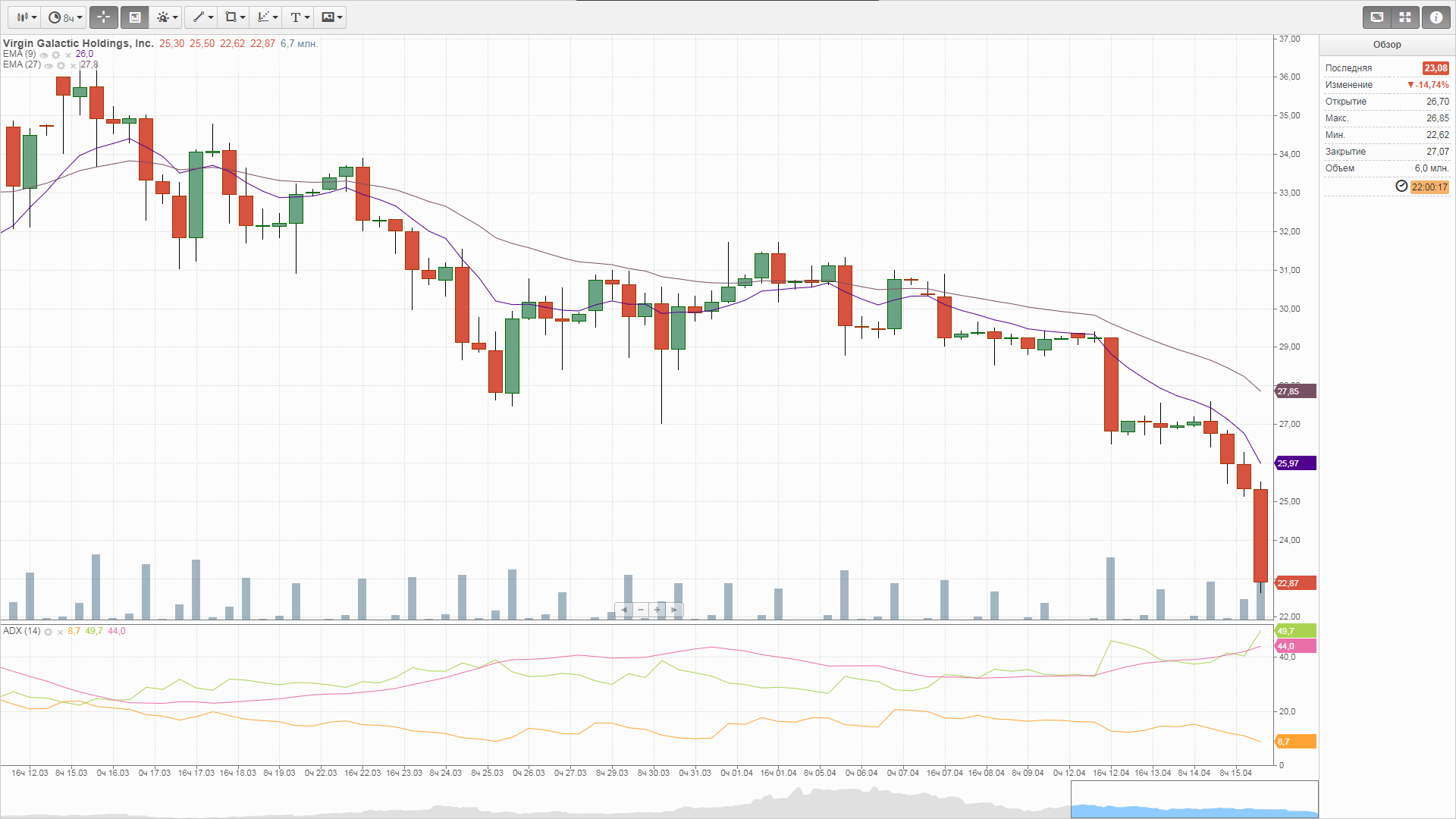 характер расположения скользящих указывает на то, что дальнейшее снижение ограничено, думаю 22.80 устоит и состоится возврат на 24-26, там дальше посмотрим