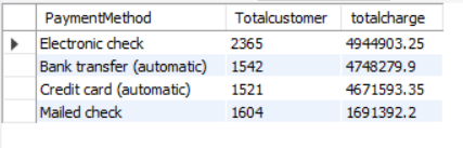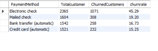 SELECT PAYMENTMETHOD, COUNT(*) AS TOTALCUSTOMER, SUM(CHURN) AS CHURNEDCUSTOMERS, CAST(SUM(CHURN) * 1.0 / COUNT(*) *100 AS DECIMAL (10,2)) AS CHURNRATE FROM CHURNDATA GROUP BY PAYMENTMETHOD ORDER BY CHURNRATE DESC;