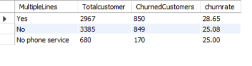SELECT MULTIPLELINES, COUNT(*) AS TOTALCUSTOMER, SUM(CHURN) AS CHURNEDCUSTOMERS, CAST(SUM(CHURN) * 1.0 / COUNT(*) *100 AS DECIMAL (10,2)) AS CHURNRATE FROM CHURNDATA GROUP BY MULTIPLELINES ORDER BY CHURNRATE DESC;