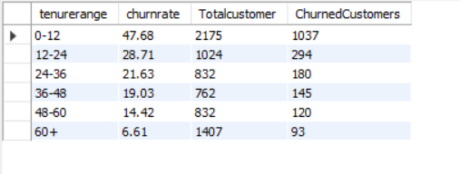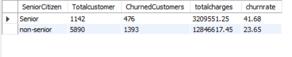 SELECT CASE WHEN SENIORCITIZEN=1 THEN ‘SENIOR’ ELSE ‘NON-SENIOR’ END AS SENIORCITIZEN, COUNT(*) AS TOTALCUSTOMER, SUM(CHURN) AS CHURNEDCUSTOMERS, ROUND(SUM(TOTALCHARGES),2) AS TOTALCHARGES, CAST(SUM(CHURN) * 1.0 / COUNT(*) *100 AS DECIMAL (10,2)) AS CHURNRATE FROM CHURNDATA GROUP BY SENIORCITIZEN ORDER BY CHURNRATE DESC;