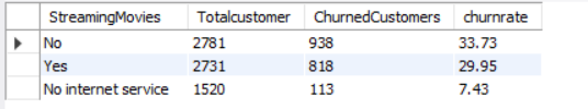 SELECT STREAMINGMOVIES, COUNT(*) AS TOTALCUSTOMER, SUM(CHURN) AS CHURNEDCUSTOMERS, CAST(SUM(CHURN) * 1.0 / COUNT(*) *100 AS DECIMAL (10,2)) AS CHURNRATE FROM CHURNDATA GROUP BY STREAMINGMOVIES ORDER BY CHURNRATE DESC;