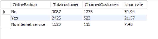 SELECT ONLINEBACKUP, COUNT(*) AS TOTALCUSTOMER, SUM(CHURN) AS CHURNEDCUSTOMERS, CAST(SUM(CHURN) * 1.0 / COUNT(*) *100 AS DECIMAL (10,2)) AS CHURNRATE FROM CHURNDATA GROUP BY ONLINEBACKUP ORDER BY CHURNRATE DESC;