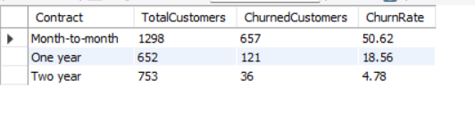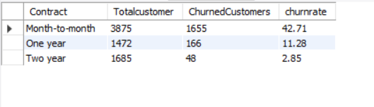 SELECT CONTRACT, COUNT(*) AS TOTALCUSTOMER, SUM(CHURN) AS CHURNEDCUSTOMERS, CAST(SUM(CHURN) * 1.0 / COUNT(*) *100 AS DECIMAL (10,2)) AS CHURNRATE FROM CHURNDATA GROUP BY CONTRACT ORDER BY CHURNRATE DESC;