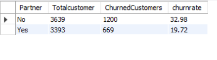 SELECT PARTNER, COUNT(*) AS TOTALCUSTOMER, SUM(CHURN) AS CHURNEDCUSTOMERS, CAST(SUM(CHURN) * 1.0 / COUNT(*) *100 AS DECIMAL (10,2)) AS CHURNRATE FROM CHURNDATA GROUP BY PARTNER ORDER BY CHURNRATE DESC;