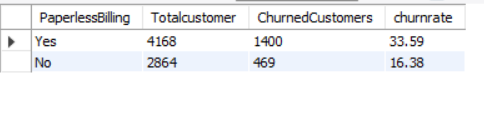 SELECT PAPERLESSBILLING, COUNT(*) AS TOTALCUSTOMER, SUM(CHURN) AS CHURNEDCUSTOMERS, CAST(SUM(CHURN) * 1.0 / COUNT(*) *100 AS DECIMAL (10,2)) AS CHURNRATE FROM CHURNDATA GROUP BY PAPERLESSBILLING ORDER BY CHURNRATE DESC;