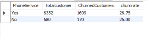 SELECT PHONESERVICE, COUNT(*) AS TOTALCUSTOMER, SUM(CHURN) AS CHURNEDCUSTOMERS, CAST(SUM(CHURN) * 1.0 / COUNT(*) *100 AS DECIMAL (10,2)) AS CHURNRATE FROM CHURNDATA GROUP BY PHONESERVICE ORDER BY CHURNRATE DESC;