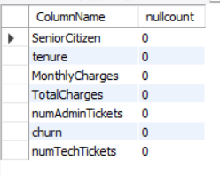 SELECT ‘SENIORCITIZEN’ AS COLUMNNAME, COUNT(*) AS NULLCOUNT FROM CHURNDATA WHERE ‘SENIORCITIZEN’ IS NULL UNION